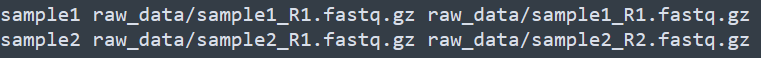 \t分隔的三列文件,第一列为样本名称,第二列和第三列分别对应R1端和R2端的序列文件。配置文件写好之后,直接运行一下代码即可