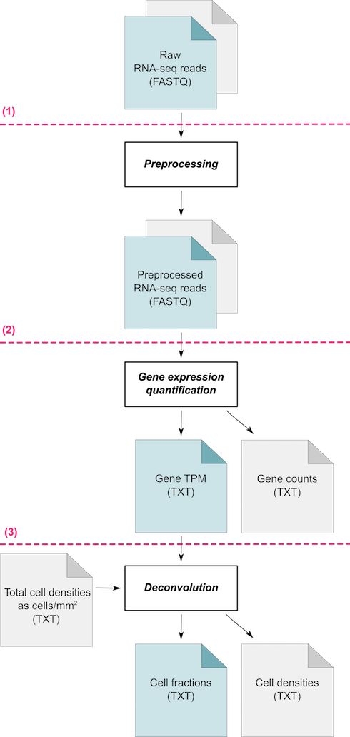 该软件设计成pipeline的形式,直接输入样本对应的测序原始数据,进行预处理,定量,免疫细胞组分预测,数据分析流程示意如下