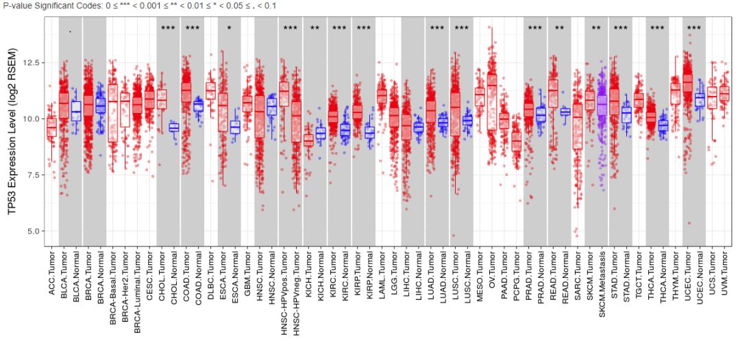 比较肿瘤样本和正常组织中基因表达量的差异,结果用箱体图展示,示意如下