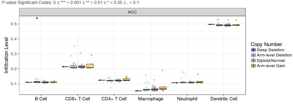 探究肿瘤免疫细胞浸润与体细胞拷贝数的相关性,通过该基因的拷贝数情况将样本分为四类,比较四类样本间浸润的免疫细胞分布情况,结果示意如下