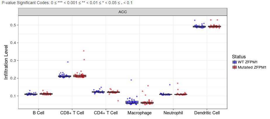 探究肿瘤免疫细胞浸润与体细胞突变的相关性,利用是否包含该基因的突变将肿瘤样本分为野生型和突变型两类,比较两类样本间浸润的免疫细胞分布情况,结果示意如下