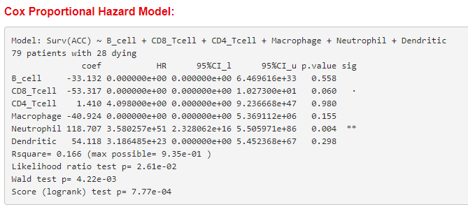 利用浸润的免疫细胞和基因表达量等信息进行生存分析,给出了cox回归模型的公式,示意如下