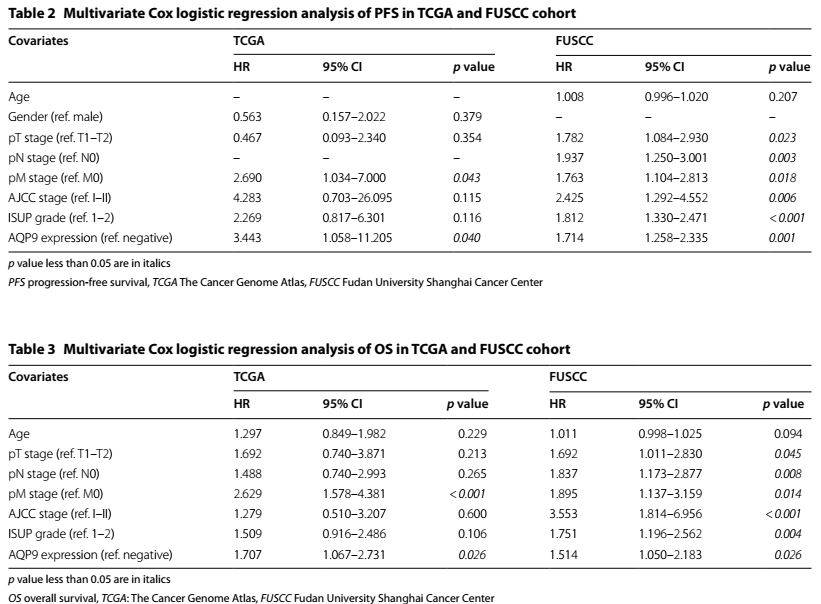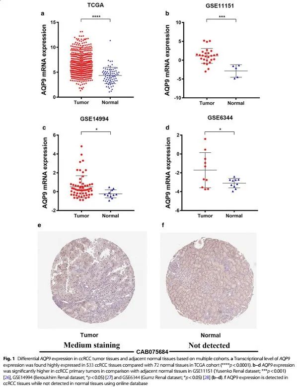 基因表达差异与病理分析,存活率之间的相关性,属于临床意义的探究。结果表明,AQP9与肾癌的病理分期、临床预后密切相关,临床意义很大。