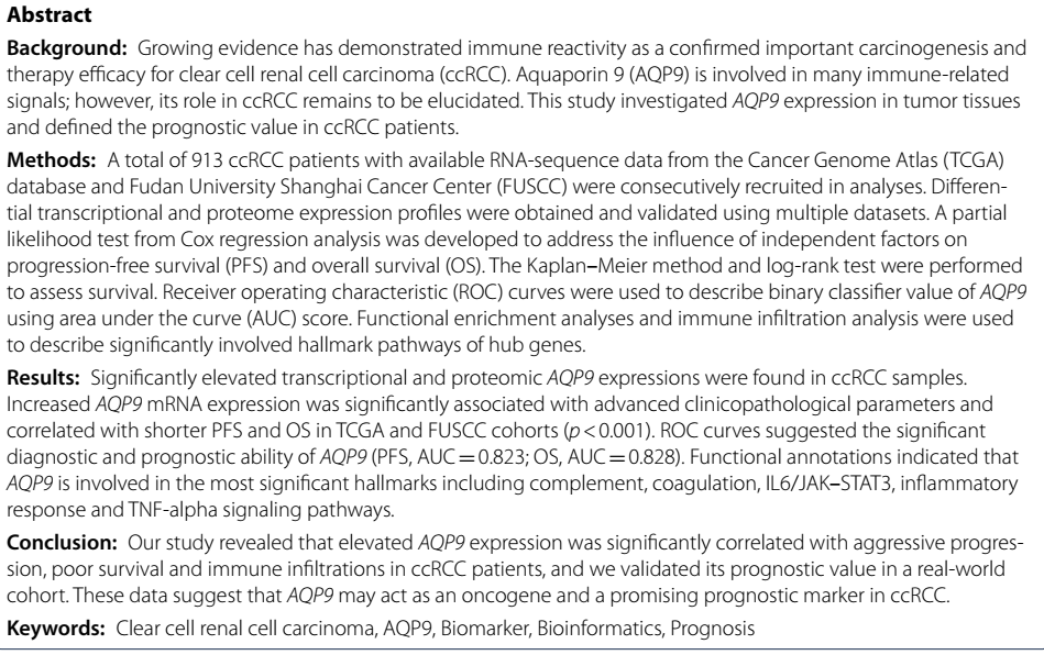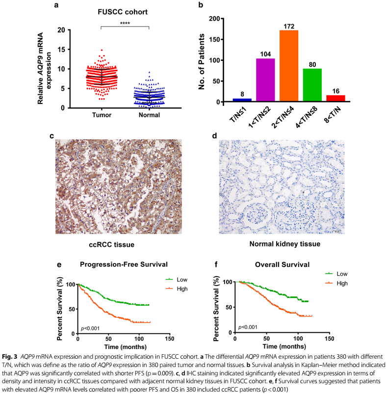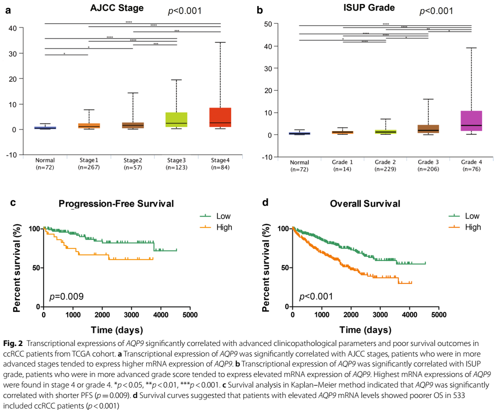 基因表达差异与病理分析,存活率之间的相关性,属于临床意义的探究。结果表明,AQP9与肾癌的病理分期、临床预后密切相关,临床意义很大。