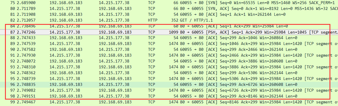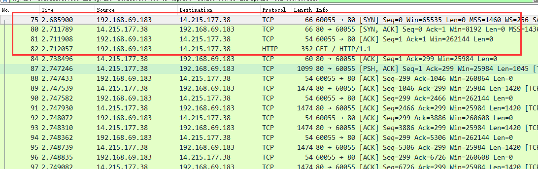那么红框内的前三条就是tcp的握手了。对比一下前后两图,客户端即本机source的60055端口发送一个包给14.215.177.38(百度)的80端口,内容为SYN=1,seq=0(第一次握手)。百度接收到请求后,返回一个包给本机,内容为SYN=1,ACK=1,seq=0,ack=1(第二次握手),这里大写的为标志位,小写的为数据。本机接收到百度返回的包之后,也发送一个包给百度,内容为ACK=1,seq=1,ack=1(第三次握手),到这里三次握手全部完成,连接建立。发现下面一行的包是http的,这也验证了http是基于tcp协议的,需要先建立tcp连接http才能启动。