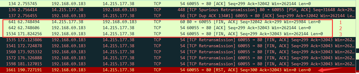 看红框中第一行知道时百度发出的断开连接请求,再看红框的上一行,对比一下第二列会发现正好差60,单位秒,因为访问百度的人很多,如果你没有实际操作不可能给你一直占用资源,所以当超过60s也就是一分钟还无操作的时候百度就会自动发起断开请求。也正因为时百度发起的断开请求导致了我们只有三次挥手。