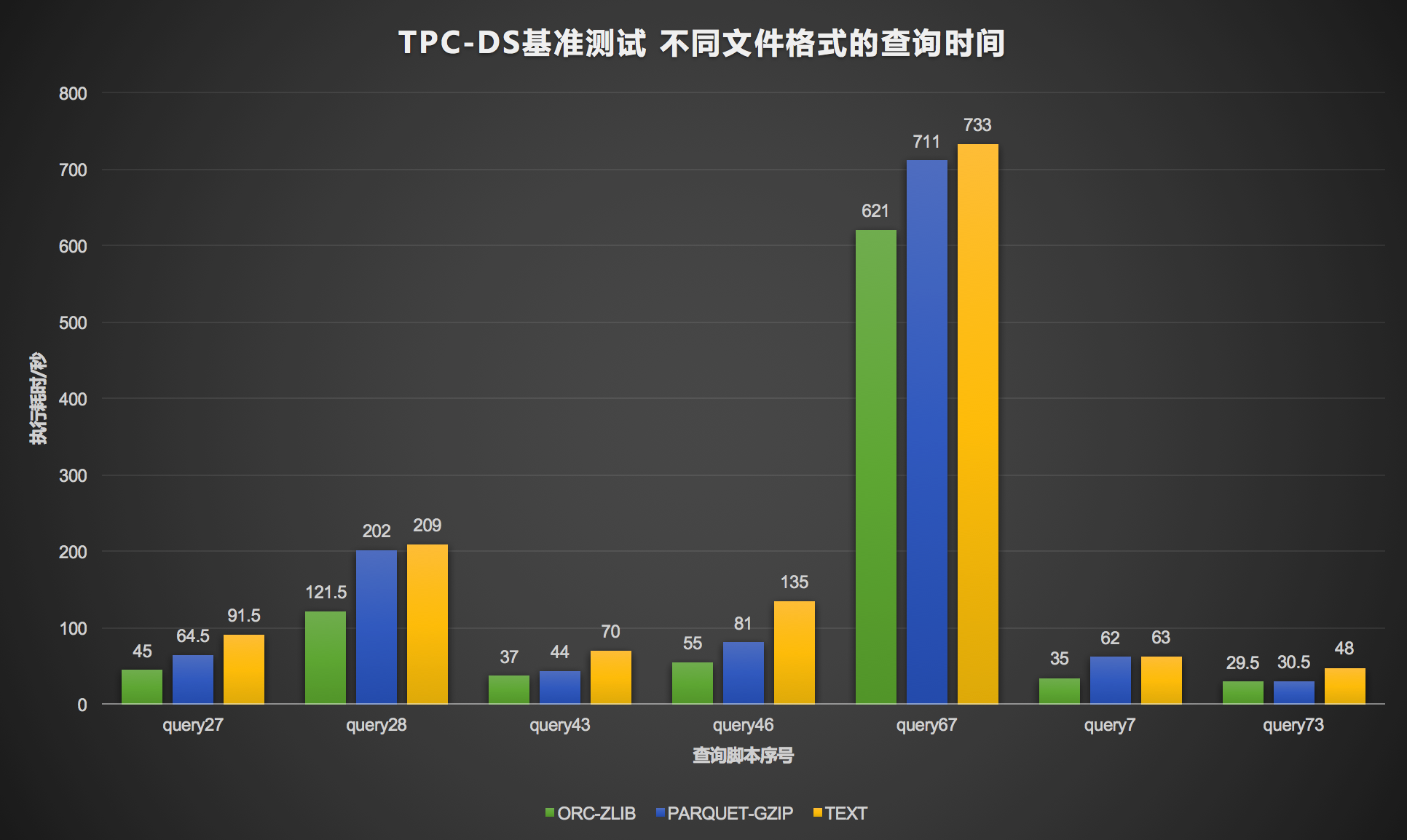 - 查询耗时(文件格式):Text > Parquet > Orc