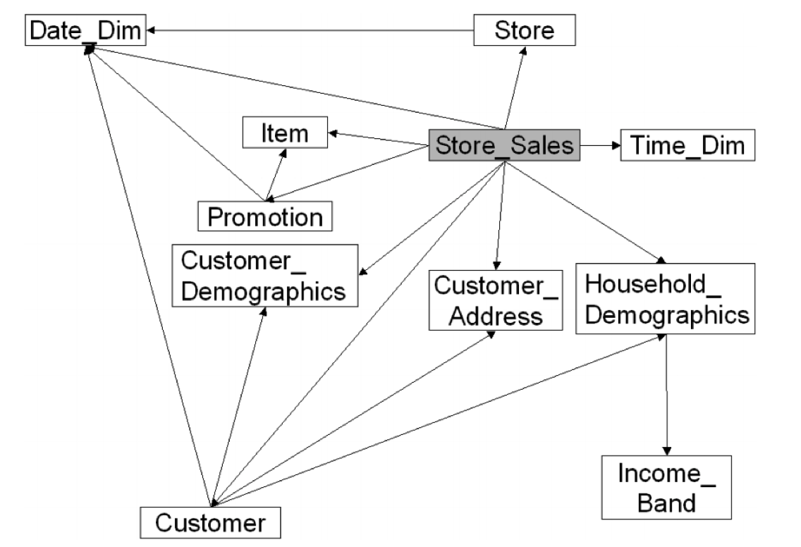 - TPC-DS测试基准是TPC组织推出的用于替代TPC-H的下一代决策支持系统测试基准:TPC-DS采用星型、雪花型等多维数据模式。它包含7张事实表,17张维度表,平均每张表有18列。