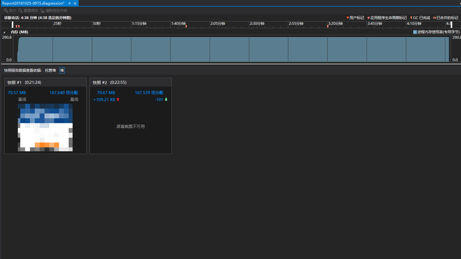 选择快照报告数据查看依据,托管堆和堆,我写的程序中是在堆中发现快照2比快照会有40多M内存的上升,上面的图片是优化后的。点击上升的内存,可以进入快照1和快照2内存的对比的表格: