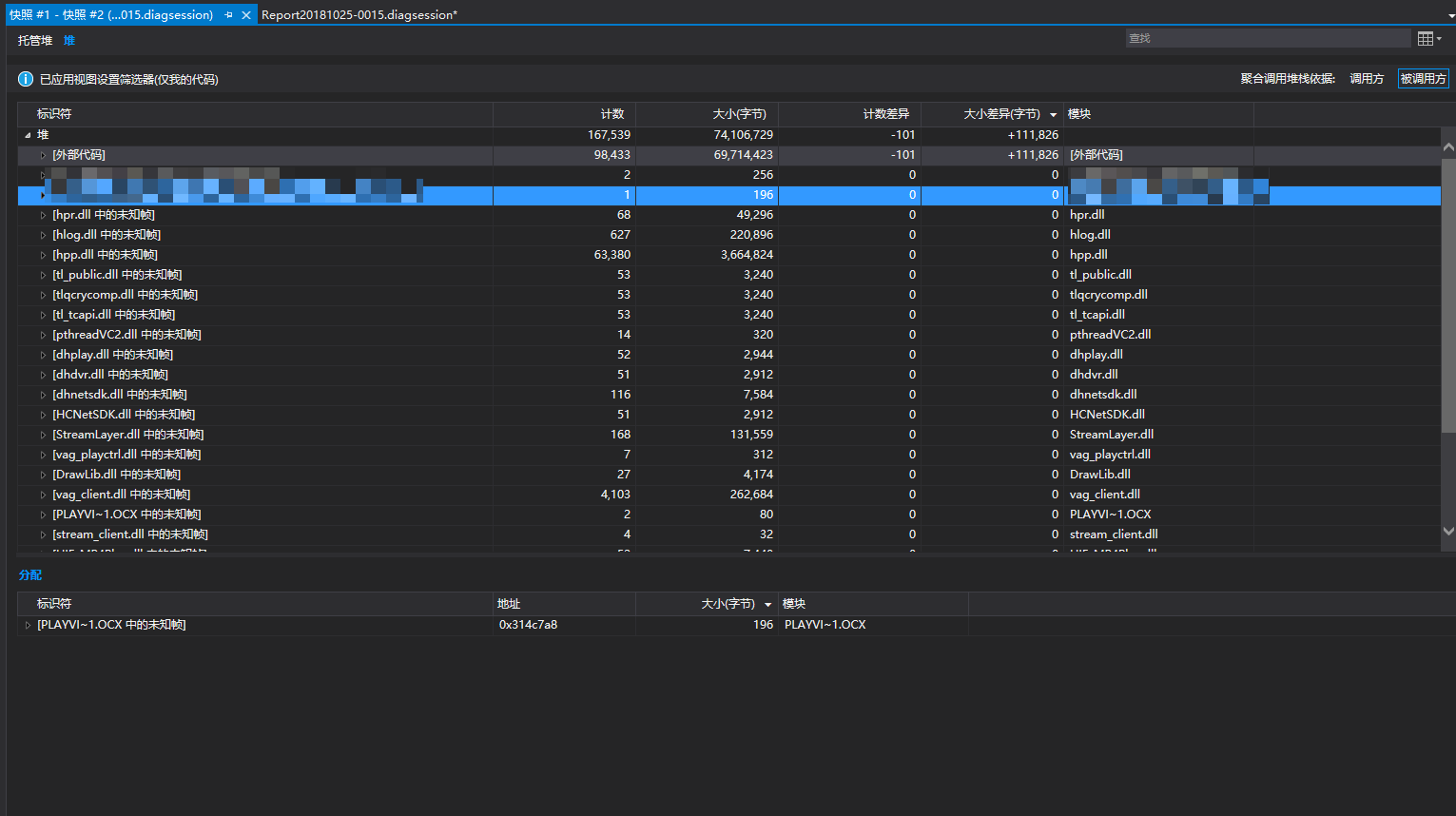 从这个前后内存的对比中,找到是由于主界面的在注销时关闭,再次登录后,主界面重新创建显示,里面ocx的内存发生泄漏。