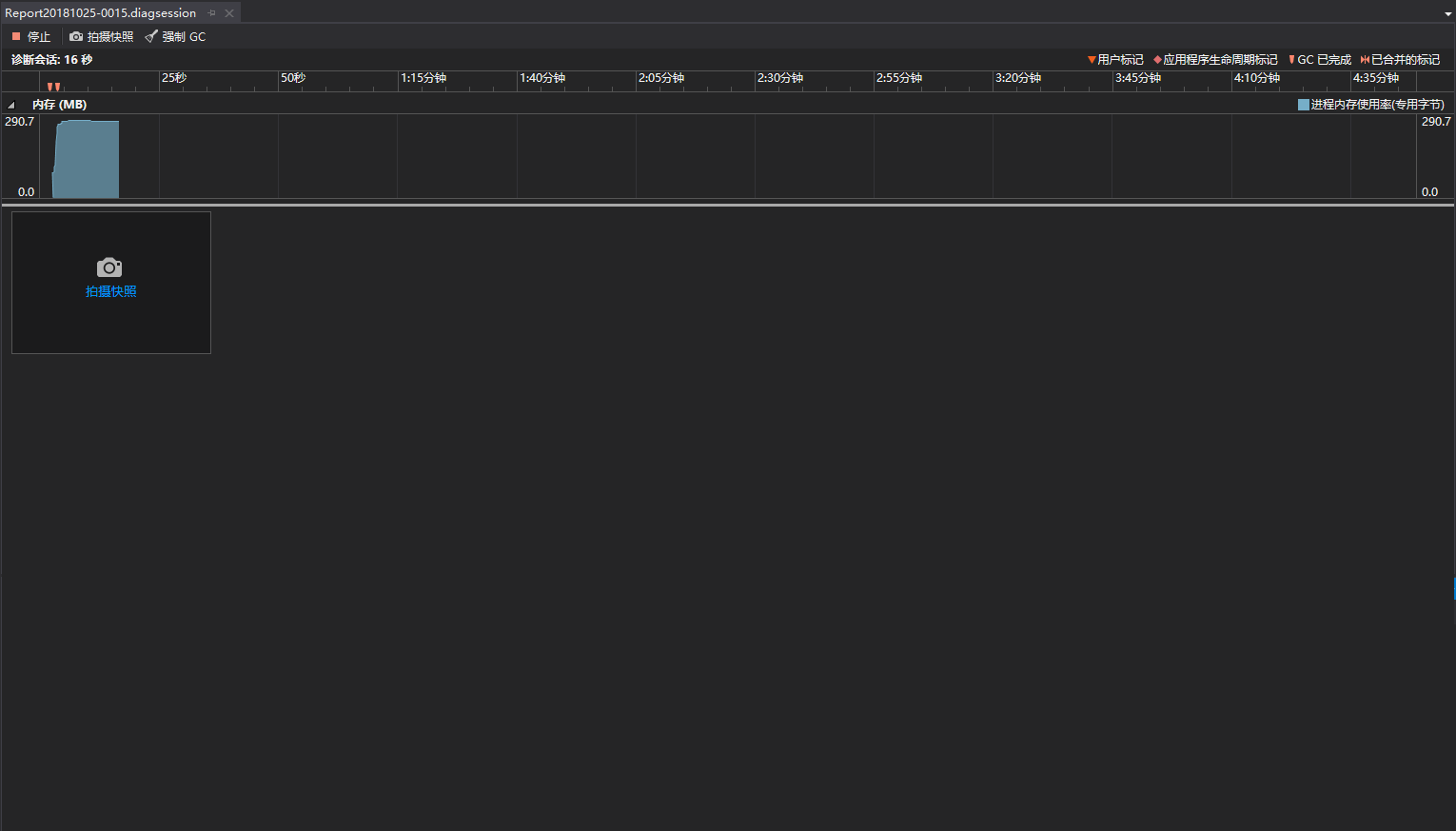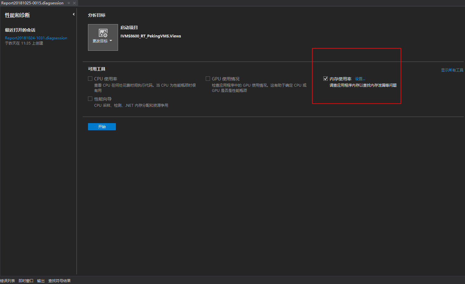 在VS2013菜单分析-》性能和诊断,打开的界面如下,并勾选内存使用率选项。