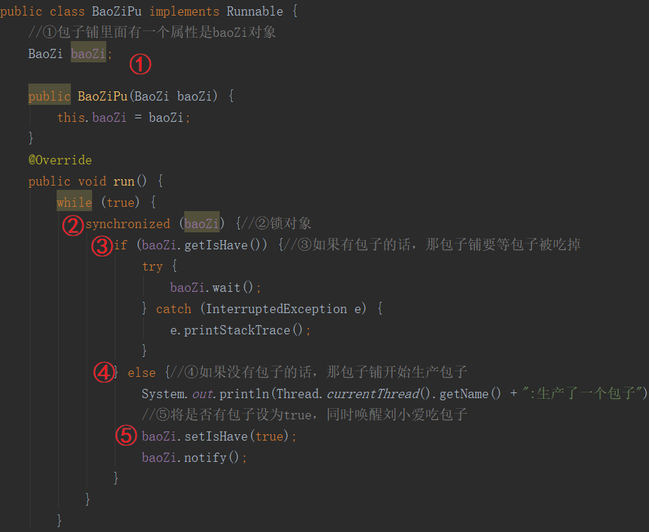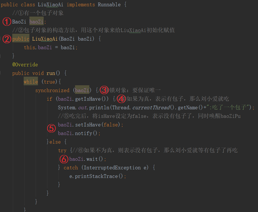 其中设定好构造方法(baozi),并且和刘小爱一样,重写run方法,while死循环。