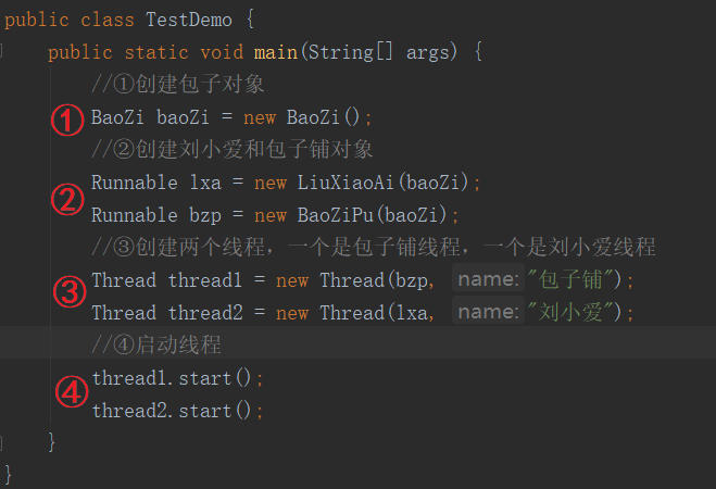 分别给线程初始化赋值:一个为包子铺线程,一个为刘小爱线程。