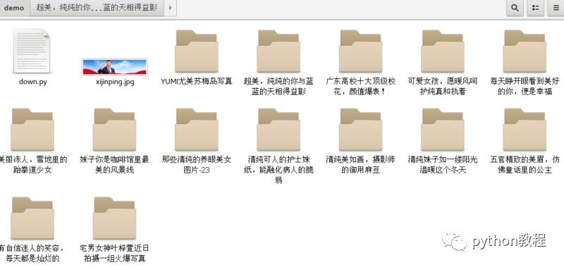 [linuxboy demo]$ python3 down.py分析http://www.meizitu.com/a/pure_2.html分析http://www.meizitu.com/a/pure_1.html['http://www.meizitu.com/a/5585.html', 'http://www.meizitu.com/a/5577.html', 'http://www.meizitu.com/a/5576.html', 'http://www.meizitu.com/a/5574.html', 'http://www.meizitu.com/a/5569.html', .......<function current_thread at 0x7fa5121f2268> is running<function current_thread at 0x7fa5121f2268> is running<function current_thread at 0x7fa5121f2268> is running进行到我这里了清纯妹子如一缕阳光温暖这个冬天 获取成功清纯妹子如一缕阳光温暖这个冬天目录创建成功可爱女孩,愿暖风呵护纯真和执着 获取成功可爱女孩,愿暖风呵护纯真和执着目录创建成功超美,纯纯的你与蓝蓝的天相得益彰 获取成功超美,纯纯的你与蓝蓝的天相得益彰目录创建成功美丽冻人,雪地里的跆拳道少女 获取成功五官精致的美眉,仿佛童话里的公主 获取成功有自信迷人的笑容,每天都是灿烂的 获取成功五官精致的美眉,仿佛童话里的公主目录创建成功有自信迷人的笑容,每天都是灿烂的目录创建成功清纯美如画,摄影师的御用麻豆 获取成功