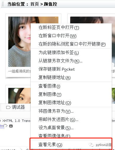 我们需要分析页面中的逻辑。首先打开 http://www.meizitu.com/a/pure... ,右键审查元素。