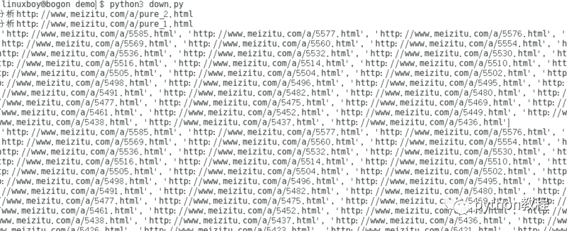 [linuxboy demo]$ python3 down.py分析http://www.meizitu.com/a/pure_2.html分析http://www.meizitu.com/a/pure_1.html['http://www.meizitu.com/a/5429.html', ......进行到我这里了
