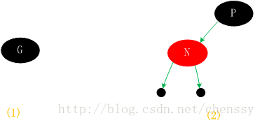 这种情况新节点N同样是直接插入,同时颜色为红色,由于根据规则四它会存在两个黑色的叶子节点,值为null。同时由于新增节点N为红色,所以通过它的子节点的路径依然会保存着相同的黑色节点数,同样满足规则5。(如图一(2))