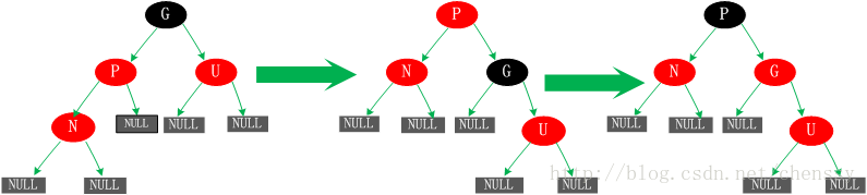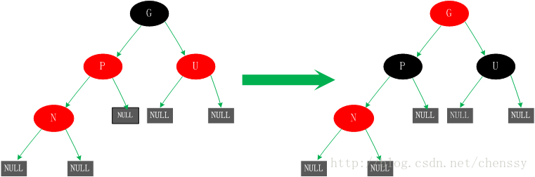对于这种情况若直接插入肯定会出现不平衡现象。怎么处理?P、U节点变黑、G节点变红。这时由于经过节点P、U的路径都必须经过G所以在这些路径上面的黑节点数目还是相同的。但是经过上面的处理,可能G节点的父节点也是红色,这个时候我们需要将G节点当做新增节点递归处理。