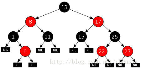 这些约束强制了红黑树的关键性质: 从根到叶子的最长的可能路径不多于最短的可能路径的两倍长。结果是这棵树大致上是平衡的。因为操作比如插入、删除和查找某个值的最坏情况时间都要求与树的高度成比例,这个在高度上的理论上限允许红黑树在最坏情况下都是高效的,而不同于普通的二叉查找树。所以红黑树它是复杂而高效的,其检索效率O(log n)。下图为一颗典型的红黑二叉树。
