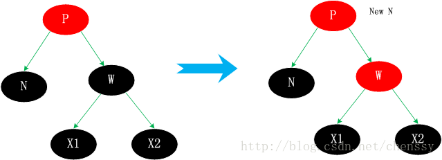对于这种情况我们对新增节点N、P进行一次左旋转。这里所产生的结果其实并没有完成,还不是平衡的(违反了规则四),这是我们需要进行情况5的操作。