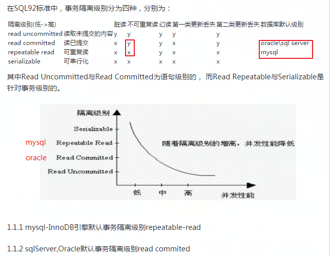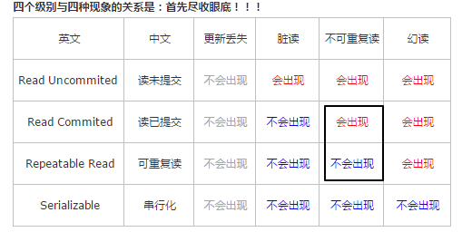 | 1、Serializable:最严格的级别,事务串行执行,资源消耗最大; 2、REPEATABLE READ:保证了一个事务不会修改已经由另一个事务读取但未提交(回滚)的数据。避免了“脏读取”和“不可重复读取”的情况,但是带来了更多的性能损失。 3、READ COMMITTED:大多数主流数据库的默认事务等级,保证了一个事务不会读到另一个并行事务已修改但未提交的数据,避免了“脏读取”。该级别适用于大多数系统。 4、Read Uncommitted:保证了读取过程中不会读取到非法数据。隔离级别在于处理多事务的并发问题。 |