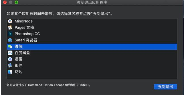 MAC有时候会由于内存占用过大或者处理器性能不够而导致应用卡死,这个时候我们就可以通过Command+Option+ESC来呼出强制退出应用功能