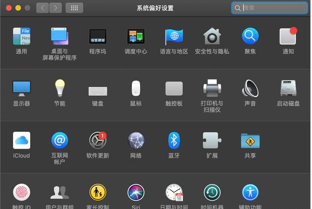 系统偏好设置可以理解为Windows中的控制面板,Mac系统中的所有功能都可以在其中设置。当你不知道某一设置具体在哪的情况下可以通过右上角的搜索框来输入关键词查找
