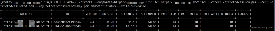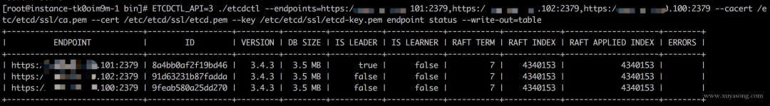 ETCDCTL_API=3 ./etcdctl --endpoints=https://0:2379,https://1:2379,https://2:2379 --cacert /etc/etcd/ssl/ca.pem --cert /etc/etcd/ssl/etcd.pem --key /etc/etcd/ssl/etcd-key.pem endpoint status --write-out=table