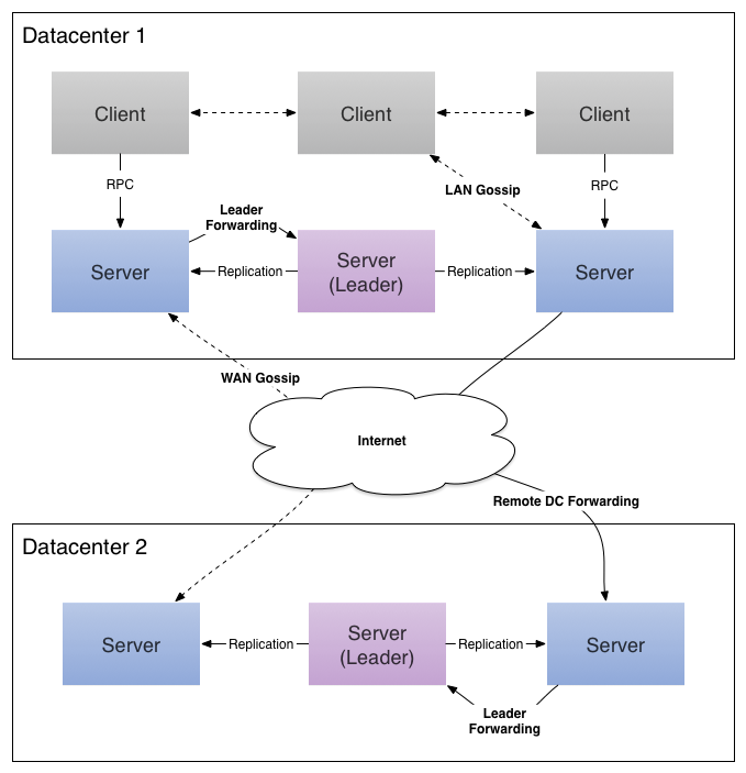 - server: 服务端, 保存配置信息, 高可用集群, 在局域网内与本地客户端通讯, 通过广域网与其它数据中心通讯。 每个数据中心的 server 数量推荐为 3 个或是 5 个。