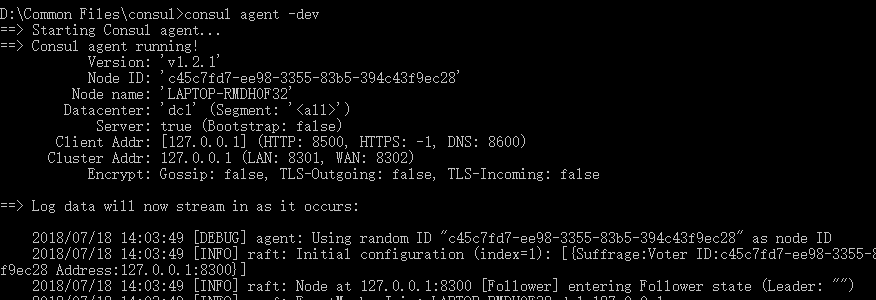 consul agent -dev # -dev表示开发模式运行,另外还有-server表示服务模式运行