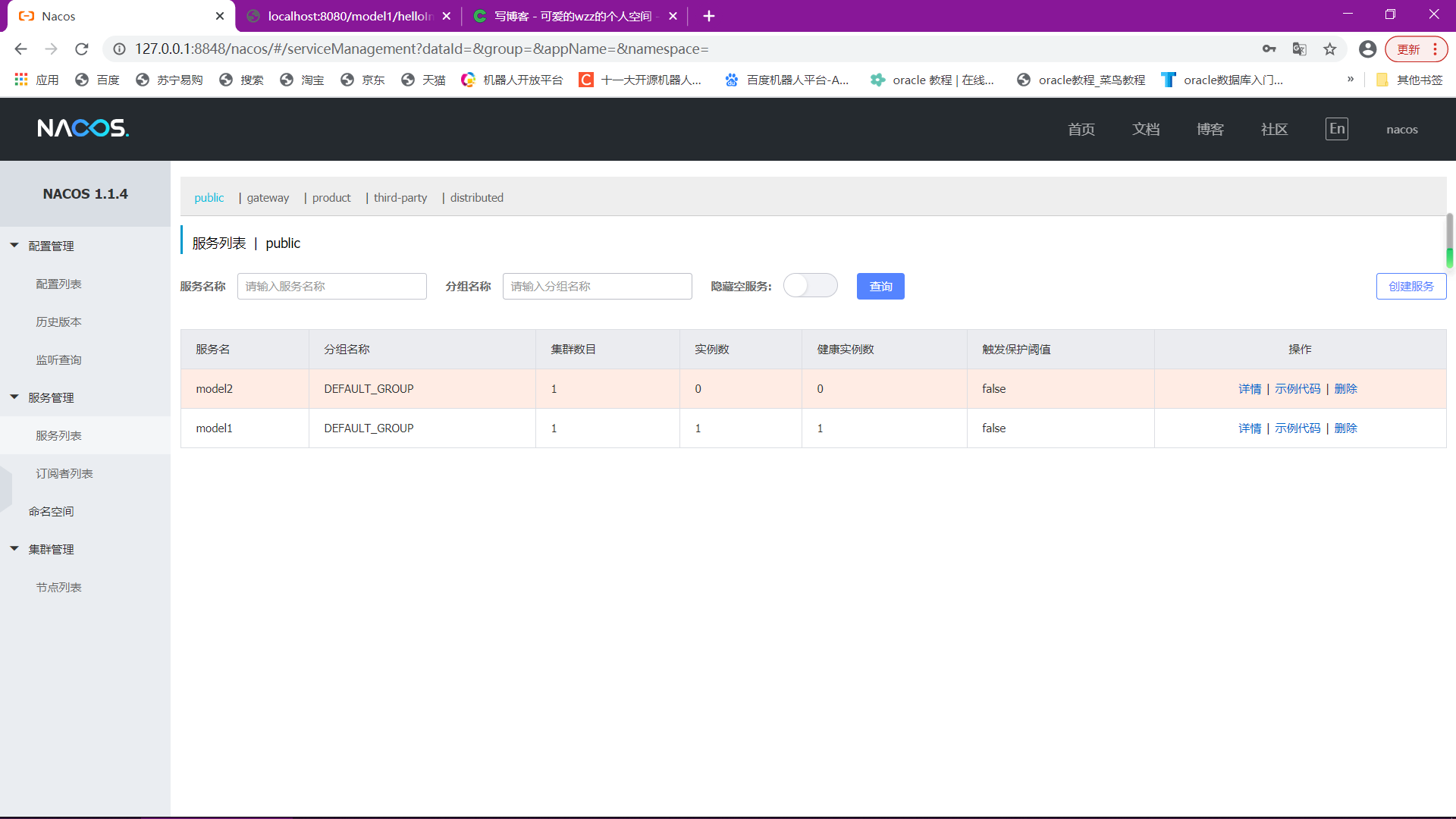 server.port=8080 spring.application.name=model1 spring.cloud.nacos.discovery.server-addr=127.0.0.1:8848