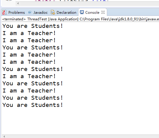 | class Lefthand extends Thread { public void run() { for(int i=0;i<=5;i++) { System.out.println("You are Students!"); try{ sleep(500); } catch(InterruptedException e) { System.out.println("Lefthand error.");} } } } class Righthand extends Thread { public void run() { for(int i=0;i<=5;i++) { System.out.println("I am a Teacher!"); try{ sleep(300); } catch(InterruptedException e) { System.out.println("Righthand error.");} } } } public class ThreadTest { static Lefthand left; static Righthand right; public static void main(String[] args) { left=new Lefthand(); right=new Righthand(); left.start(); right.start(); } } |