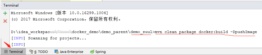 然后点击idea左小角的Terminal窗口,把demo_zuul项目,拖动到该窗口(或者输入 cd demo_zuul),然后执行mvn clean package docker:build -DpushImage
