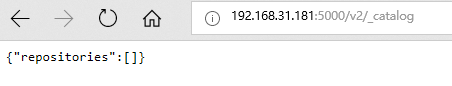 通过浏览器访问registry的入口,http://192.168.31.181:5000/v2/_catalog,可以看到返回的repositories的结果中是空的,也就是docker私服registry中,并没有私服镜像。