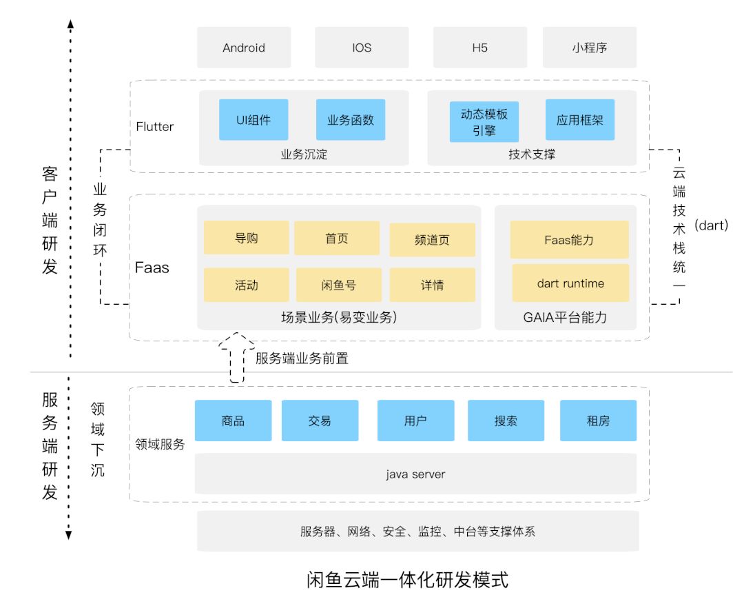 基于这样的背景, GAIA 应孕而生,与闲鱼、 aplatform 淘系互动平台两大业务紧密合作,通过 GAIA 云端 FaaS 技术能力,重新定义了研发的职责和边界,让程序员回归最初的程序,结合端上的跨平台实现云端一体的轻量级业务研发运维模式。