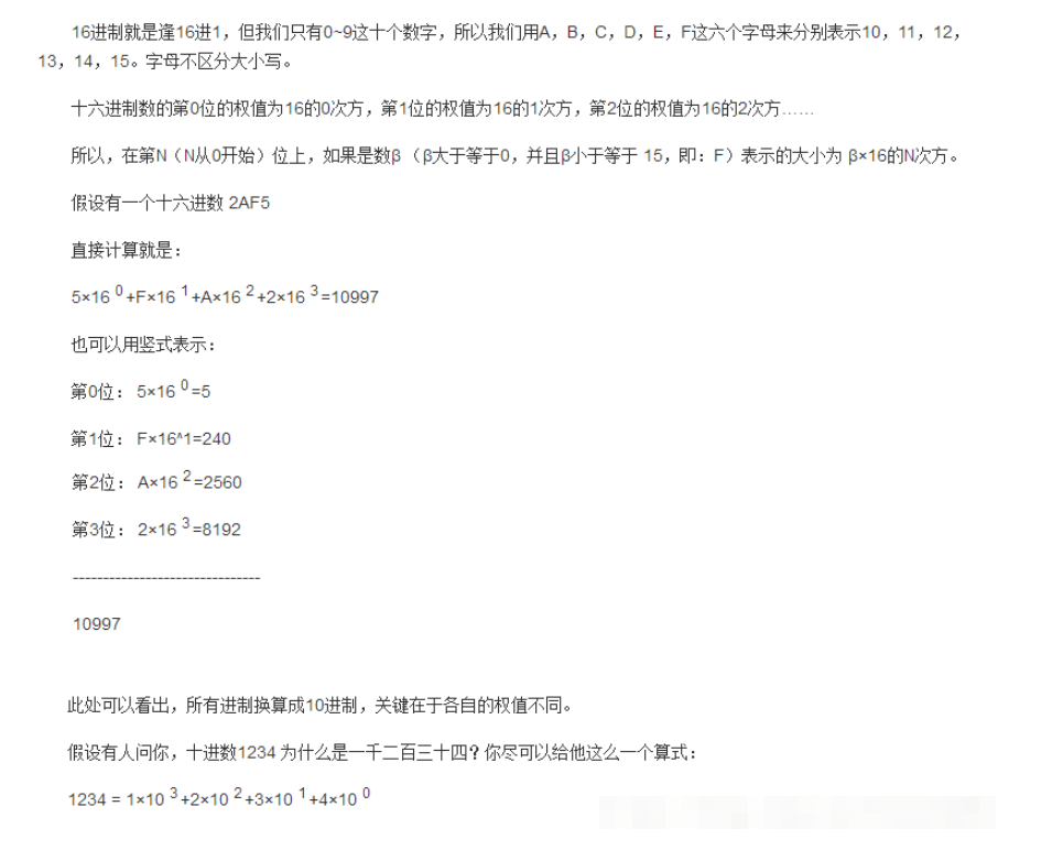 同样,如果一个二进制数很长,我们需要将它转换成10进制数时,除了前面学过的方法是,我们还可以先将这个二进制转换成16进制,然后再转换为10进制。