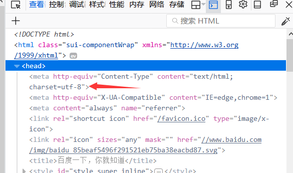 当然编码方式不是我们猜出来的,是查出来的,在查看元素中找到head标签,打开,看到charset="utf-8",就是编码方式