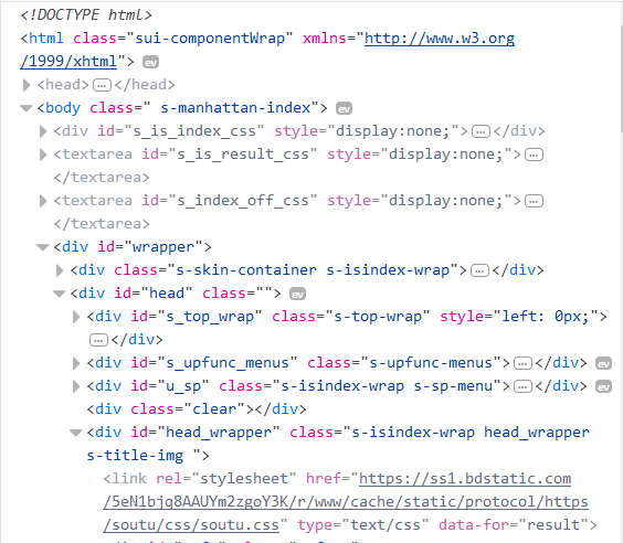 拿来对比一下,浏览器中打开www.baidu.com,查看页面元素,快捷键F12(浏览器最好用火狐或者Chrome)