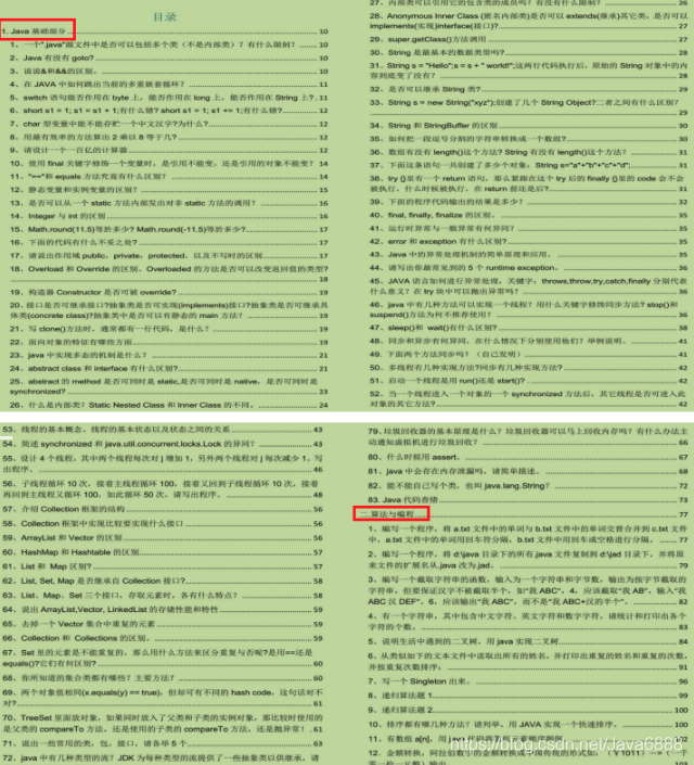 像这次Aliyun就比较重视基础,所以关于Java基础这一块的话,去刷这份<java面试宝典>有关基础这块的问题都有:java基础+算法与编程+html&JavaScript&ajax+Javaweb+数据库+XML+流行的框架与新技术+软件工程与设计模式+j2ee+EJB+webservice