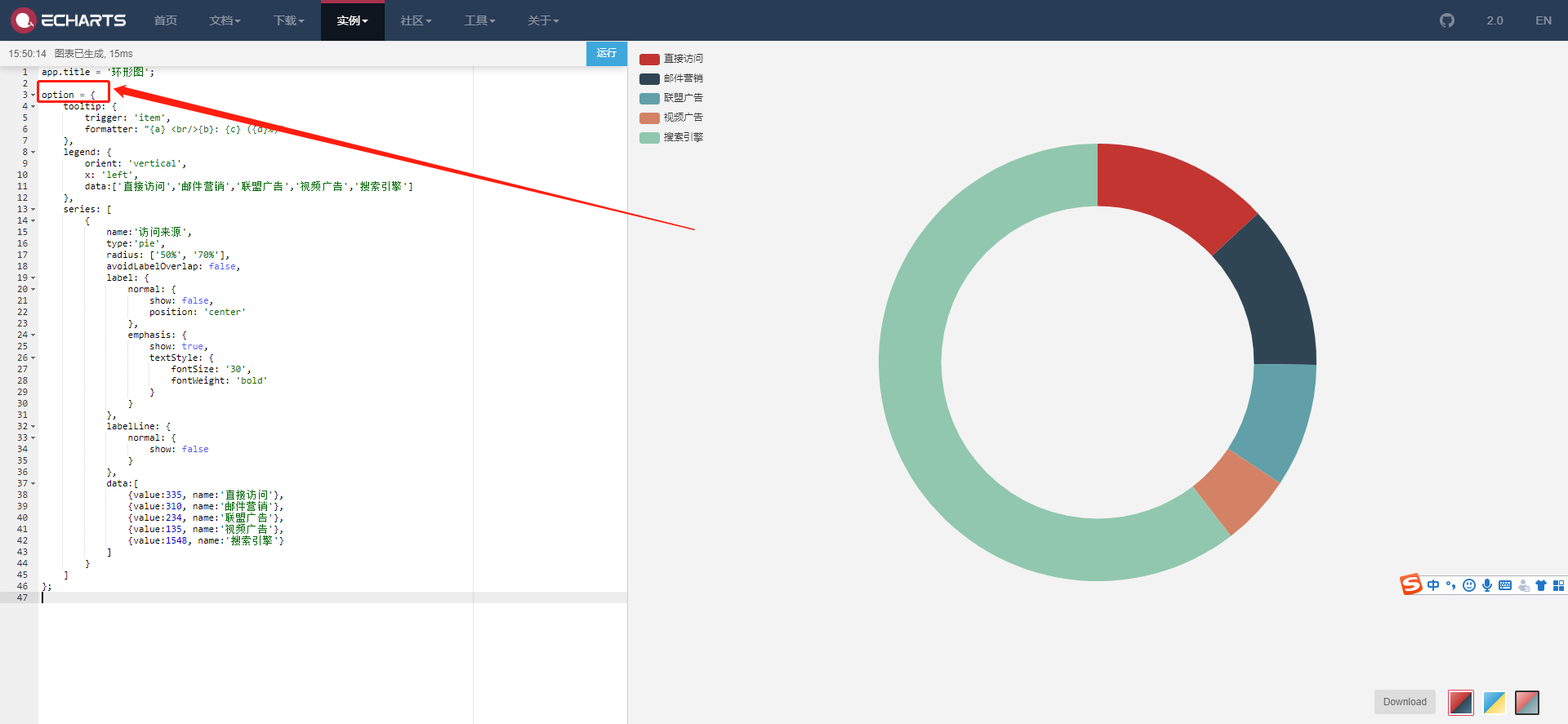 现在开始干活,进入echarts网址中,我们能看到,图表的主要参数都在option这函数里,如图1所示。我们将option()放到vue中的methods中即可引用。