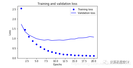 import matplotlib.pyplot as plt loss = history.history['loss']val_loss = history.history['val_loss'] epochs = range(1, len(loss) + 1) plt.plot(epochs, loss, 'bo', label='Training loss')plt.plot(epochs, val_loss, 'b', label='Validation loss')plt.title('Training and validation loss')plt.xlabel('Epochs')plt.ylabel('Loss')plt.legend() plt.show()