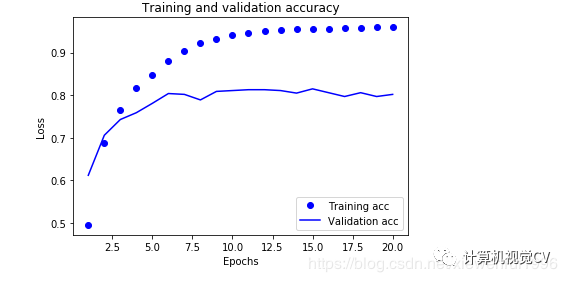 plt.clf() # clear figure(清空图像)acc = history.history['acc']val_acc = history.history['val_acc']plt.plot(epochs, acc, 'bo', label='Training acc')plt.plot(epochs, val_acc, 'b', label='Validation acc')plt.title('Training and validation accuracy')plt.xlabel('Epochs')plt.ylabel('Loss')plt.legend()plt.show()