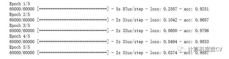 训练过程中显示了两个数字:一个是网络在训练数据上的损失(loss),另一个是网络在 训练数据上的精度(acc)。我们很快就在训练数据上达到了 0.989(98.9%)的精度。现在我们来检查一下模型在测试集上的性能。