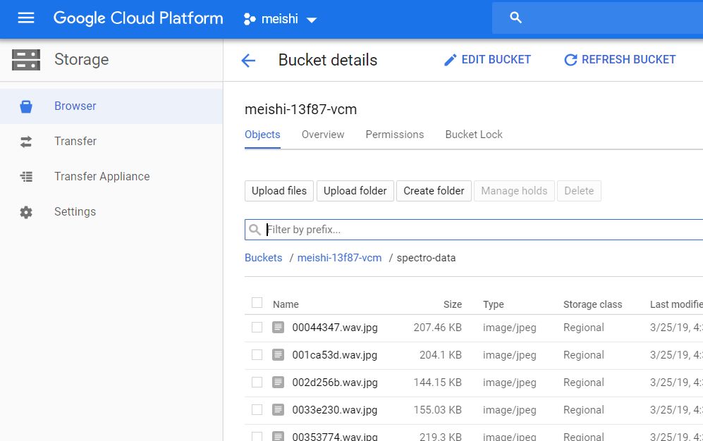 现在已经为训练音频数据生成了频谱图,将所有这些图像文件移到Google云端存储(GCS)上,然后将在那里使用AutoML Vision UI中的这些文件。