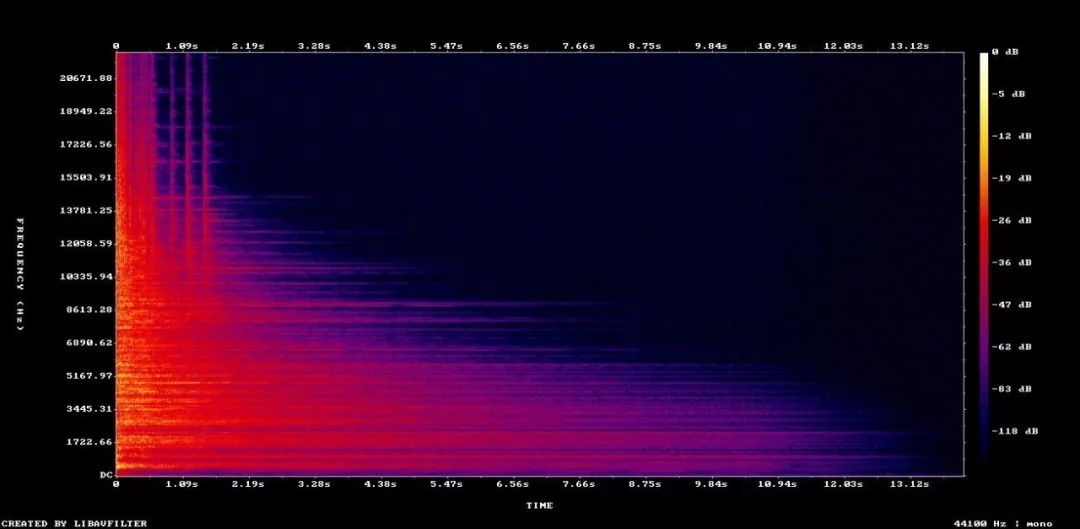 红色区域显示音频文件中存在的不同频率的响度,并随时间表示。在上面的例子中,听到了踩镲。文件的第一部分是响亮的,然后声音逐渐消失,同样可以在其频谱图中看到。