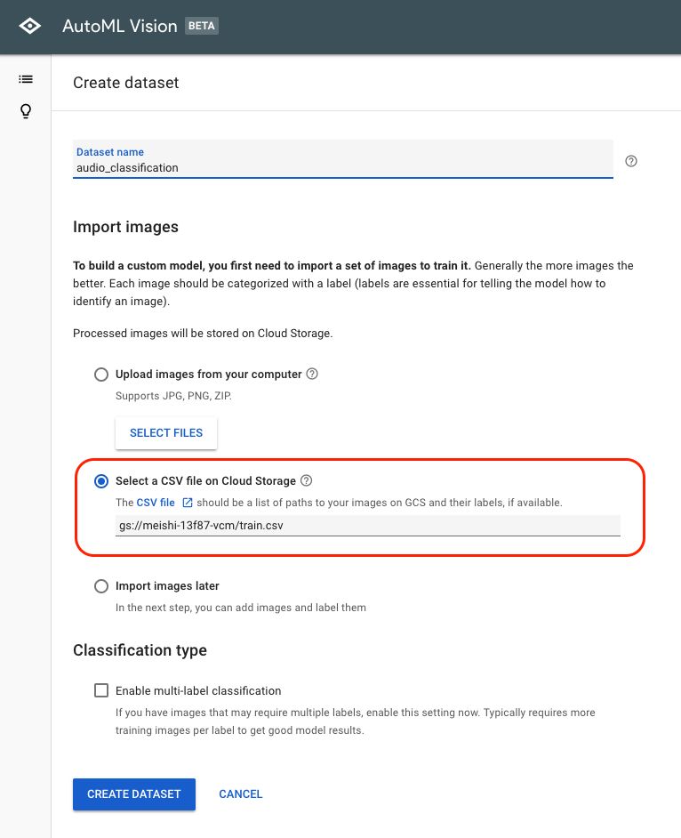 根据选择输入数据集名称并导入图像,选择第二个选项“在云存储上选择CSV文件”,并提供云存储上CSV文件的路径。