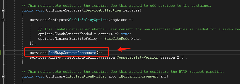 在没有注入 HttpContextAccessor的项目中,还需在ConfigureServices 方法中调用