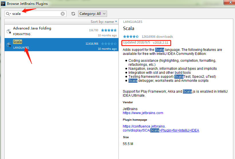 点击后,可以查到需要一个v2018.2.11版本的Scala插件