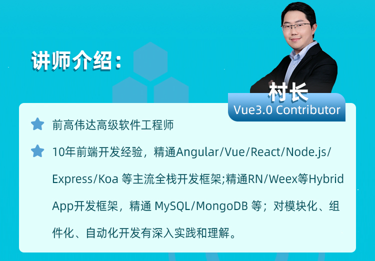 杨老师是前高伟达高级软件工程师,拥有15年工作经验,10年前端经验,精通Angular, Vue, React, Node.js, Express, Koa 等主流全栈开发框架;精通RN、Weex 等 Hybrid App开发框架,对模块化、组件化、自动化开发有深入实践和理解。