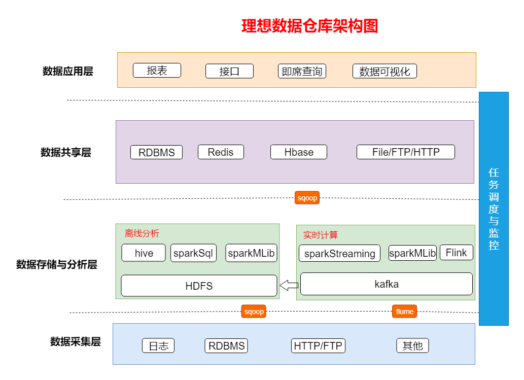 应用层:对不同的应用提供对应的数据。该层主要是提供数据产品和数据分析使用的数据,比如我们经常说的报表数据